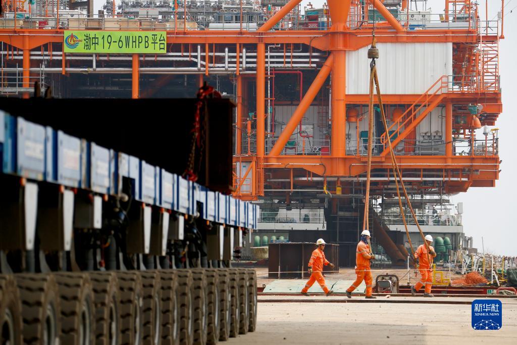 8月9日,在天津濱海新區(qū)海油工程智能化制造基地,工人進行組塊裝船前的準備工作。新華社發(fā)(杜鵬輝攝)