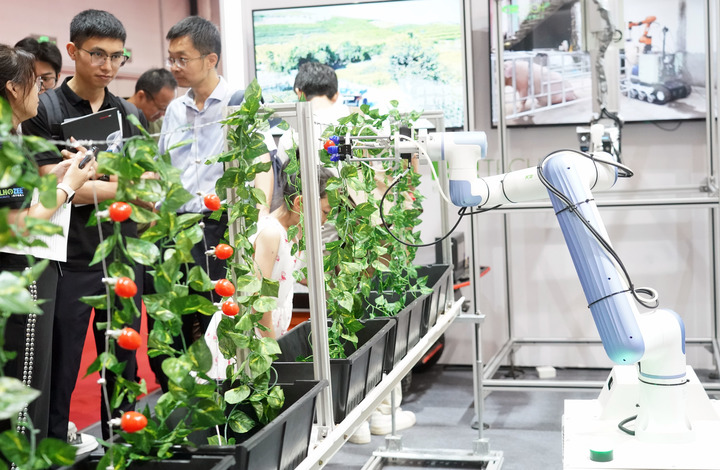 在農(nóng)業(yè)展區(qū),碩大的果園多臂采摘機器人引人注目。機械手臂通過位置和光感靈敏伸出準(zhǔn)確抓住一個蘋果,讓觀眾對農(nóng)業(yè)現(xiàn)代化和智能化有了更直觀的了解。這款機器人由北京市農(nóng)林科學(xué)院智能裝備技術(shù)研究中心研制,通過機械臂和果實獲取裝置,實現(xiàn)采果、納果、儲果全程自動化采收,并具備晝夜連續(xù)作業(yè)的能力,每小時可以采摘400至550果,大幅提升了采摘效率。