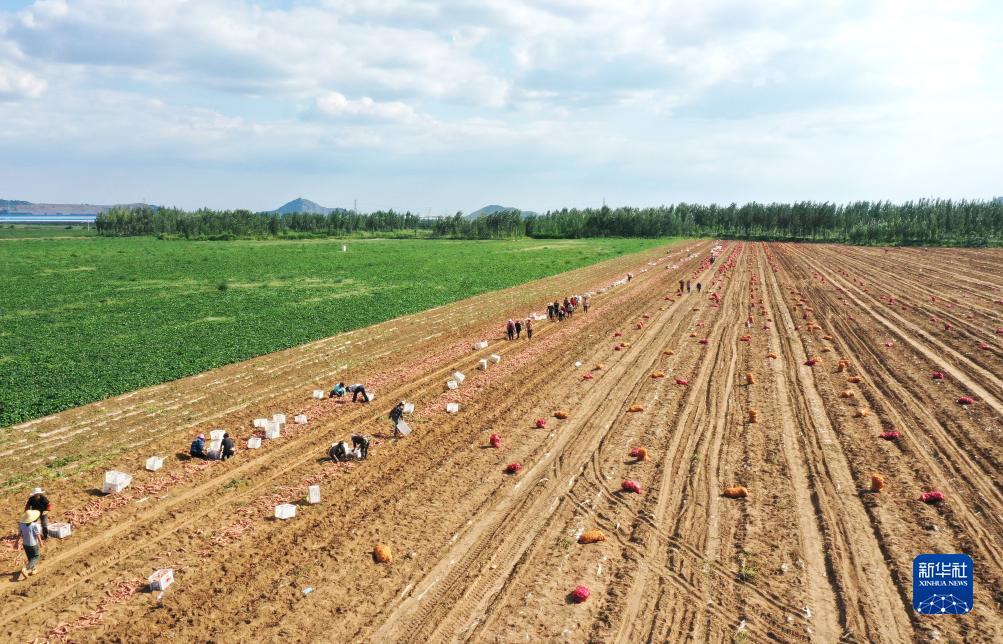 8月28日,灤州市九百戶鎮(zhèn)一家鮮食紅薯種植合作社的社員在田間收獲煙薯(無(wú)人機(jī)照片)。
