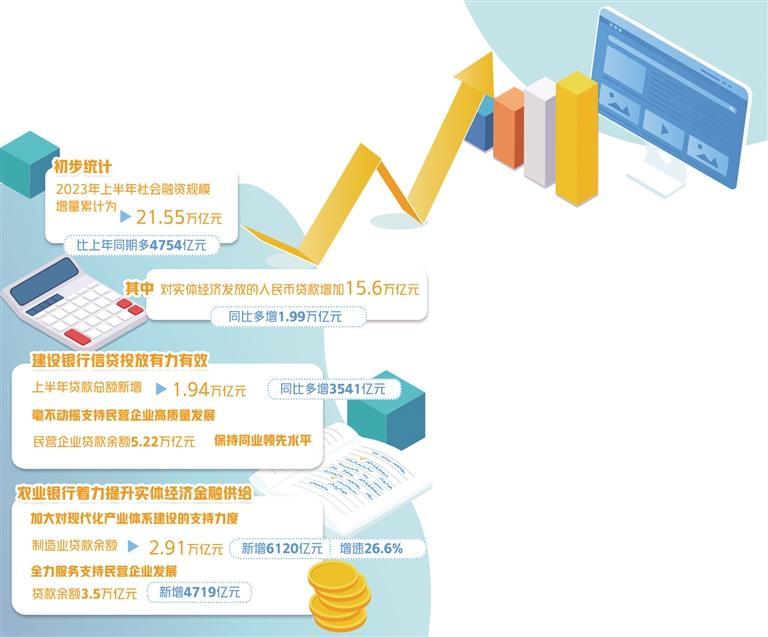 今年上半年以來,金融持續(xù)支持實體經(jīng)濟(jì)恢復(fù)發(fā)展和回升向好,金融體系對實體經(jīng)濟(jì)的支持進(jìn)一步加大。初步統(tǒng)計,2023年上半年社會融資規(guī)模增量累計為21.55萬億元,比上年同期多4754億元。其中,對實體經(jīng)濟(jì)發(fā)放的人民幣貸款增加15.6萬億元,同比多增1.99萬億元。