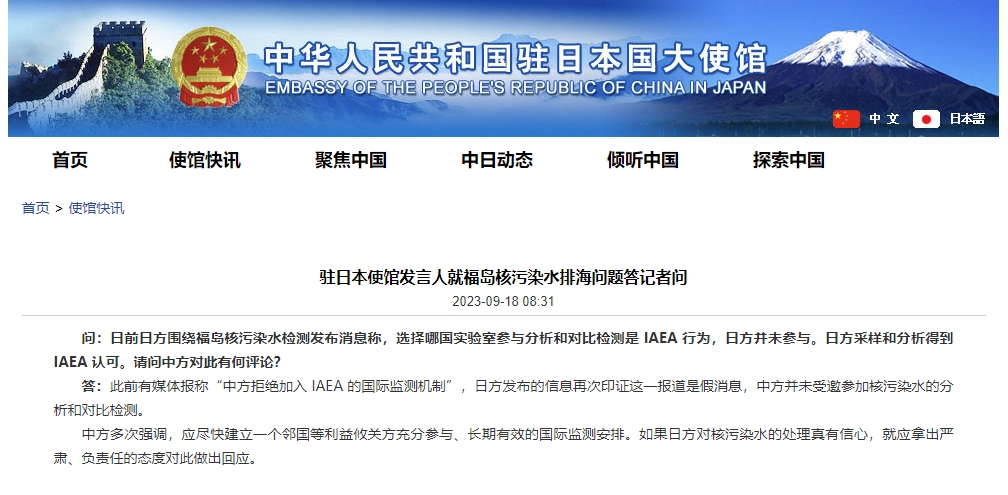 駐日本使館發(fā)言人就福島核污染水排海問題答記者問