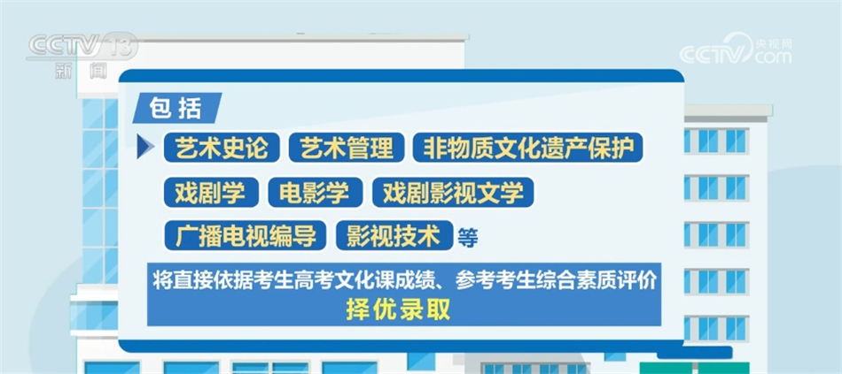 據(jù)了解,藝術類專業(yè)依據(jù)考生高考文化成績、專業(yè)考試成績,參考綜合素質(zhì)評價進行招生錄取。此次藝考改革一個重要的變化是,部分藝術類專業(yè)不再組織專業(yè)考試,包括藝術史論、藝術管理、非物質(zhì)文化遺產(chǎn)保護、戲劇學、電影學、戲劇影視文學、廣播電視編導、影視技術等,將直接依據(jù)考生高考文化課成績、參考考生綜合素質(zhì)評價,擇優(yōu)錄取。