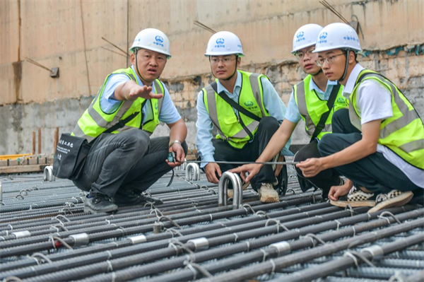照此安排,項(xiàng)目部各部門、作業(yè)隊(duì)既各自為戰(zhàn),又協(xié)調(diào)統(tǒng)一,按區(qū)域、分專業(yè)、依先后齊頭并進(jìn)。筆者在地面施工區(qū)域看到,盾構(gòu)井臨時(shí)封堵板的鋼筋綁扎已經(jīng)完成,8名作業(yè)人員和監(jiān)理、技術(shù)人員在做最后的檢查,混凝土罐車、泵車嚴(yán)陣以待……不一會兒,混凝土順著管子就流向了鋼筋網(wǎng)內(nèi),4名振搗工也隨之開始忙碌,嗡嗡聲響成一片。車站1號鋼筋場,10幾名穿著印有“鋼筋工”“信號司索工”馬甲的工人,或協(xié)助吊車調(diào)運(yùn)鋼筋、或切割鋼筋原材下料;不遠(yuǎn)處,吊車調(diào)運(yùn)明挖段鋼支撐轉(zhuǎn)場……