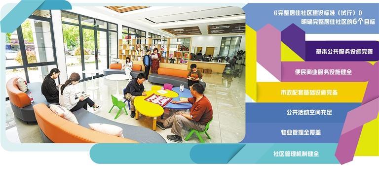 《完整居住社區(qū)建設(shè)標(biāo)準(zhǔn)(試行)》明確了完整居住社區(qū)的6個(gè)目標(biāo),包括基本公共服務(wù)設(shè)施完善、便民商業(yè)服務(wù)設(shè)施健全、市政配套基礎(chǔ)設(shè)施完備、公共活動(dòng)空間充足、物業(yè)管理全覆蓋以及社區(qū)管理機(jī)制健全,每個(gè)目標(biāo)包含相應(yīng)的建設(shè)內(nèi)容,共計(jì)20項(xiàng)。