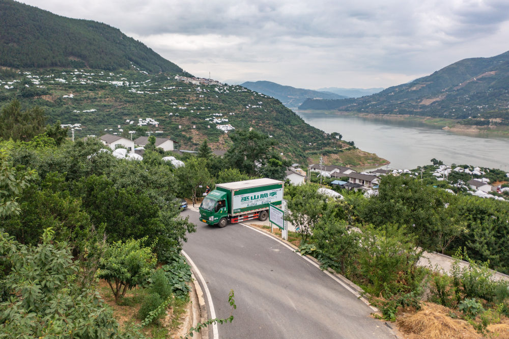 ↑重慶市巫山縣曲尺鄉(xiāng)柑園村,裝載有巫山脆李的中國郵政物流車行駛在村內(nèi)(無人機(jī)照片,6月28日攝)。過去因?yàn)槲锪鞑槐?,?jīng)過幾天的運(yùn)輸后,脆李的品質(zhì)和口感會受到影響?,F(xiàn)在,航空快遞的開通,讓巫山脆李快速走向全國。