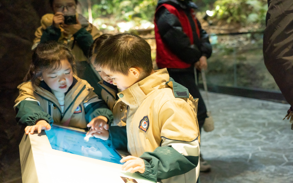 “媽媽,你看這棵樹上面也掛了牌子。”一大早,開化縣實驗幼兒園的小朋友們來到古田山探索自然的秘密。小朋友與家長沿路而上,檵木、浙江大青、赤楊葉等植物被一一記錄在研學手冊上,有的小朋友還手持放大鏡觀察植物的脈絡紋理,將自己喜歡的樹葉記錄下來,剪出形狀。“今天很開心,我看到了喜歡的楊梅樹,還撿到了鵝卵石。”一個小朋友興奮地歡呼到。結束室外活動,孩子們與家長來到了錢江源國家公園科普館,近距離觀察野生動植物標本,學習錢江源國家公園動植物相關知識。