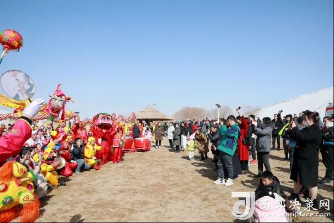 雪后的沙山與熱鬧非凡的社火表演,交織出一幅令人心花怒放的秀麗畫卷,游人近距離觀看社火表演,鉆龍、合影,祈福納祥,眾人歡聲笑語不斷,在社火中感受中國傳統(tǒng)節(jié)日獨有的民俗魅力,盡享年味敦煌。