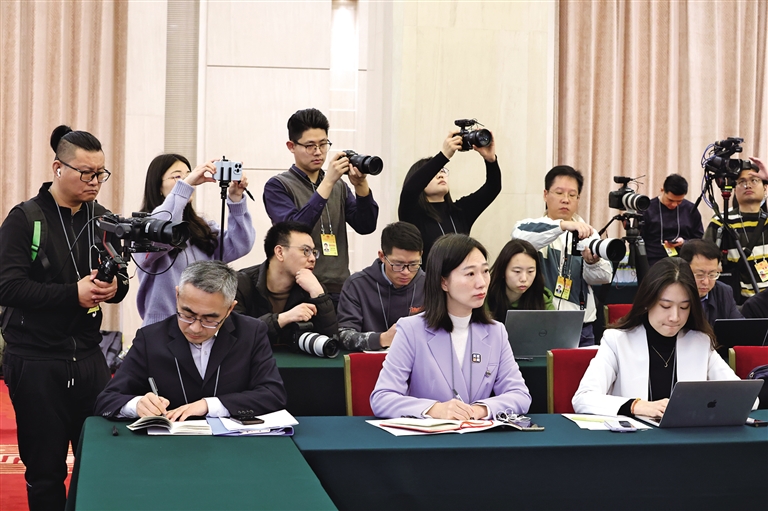 3月6日,中外媒體記者走進北京人民大會堂,參加十四屆全國人大二次會議陜西代表團媒體開放日活動。圖為記者向代表提問。記者 母家亮攝