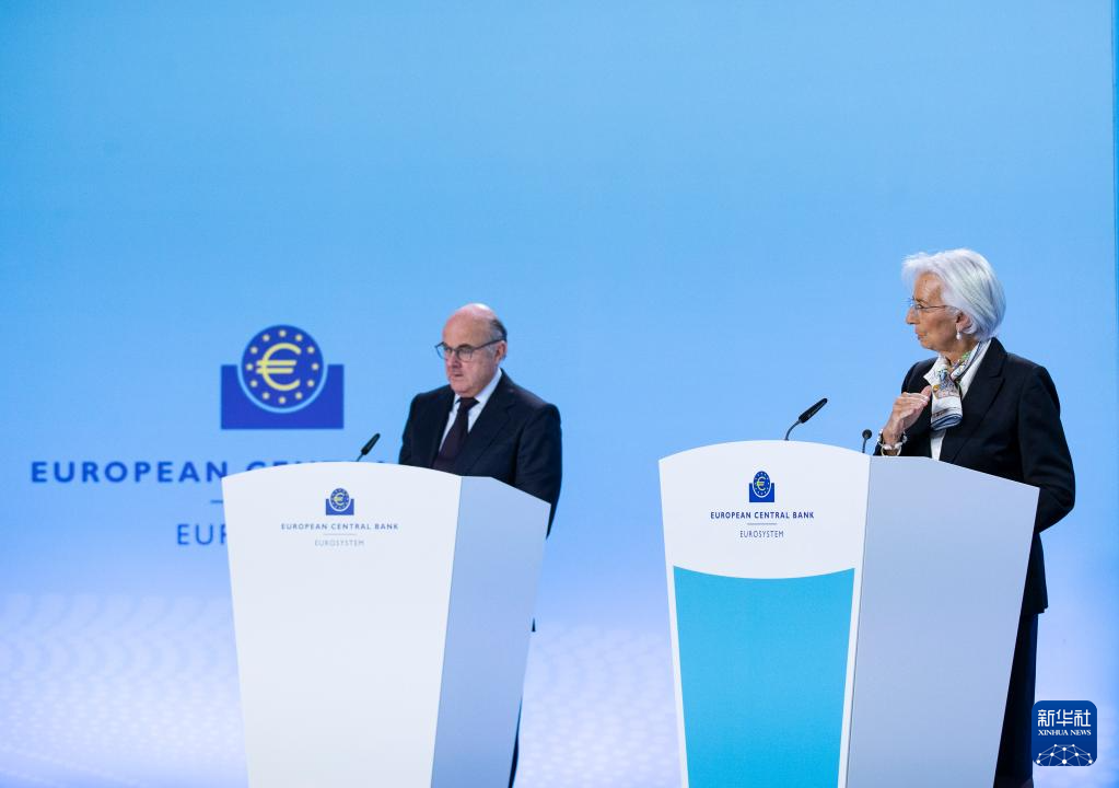 3月7日,歐洲中央銀行行長拉加德(右)在德國法蘭克福歐洲中央銀行總部舉行的新聞發(fā)布會(huì)上講話。歐洲中央銀行7日召開貨幣政策會(huì)議,決定繼續(xù)維持三大關(guān)鍵利率不變。新華社記者 張帆 攝