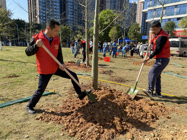 中鐵一局一公司黨委副書記、紀委書記朱懷勇帶隊,公司本部和番禺區(qū)在建項目的13名黨員代表參加了本次活動,他們統(tǒng)一著裝,手持鐵鍬、水桶等勞動工具,沐浴春日暖陽,滿懷熱情希望,認領了10棵象征著堅韌、勇氣、智慧和興旺的銀杏和香樟,栽種下中鐵一局一公司在廣東番禺屬地化發(fā)展的夢想和希望。