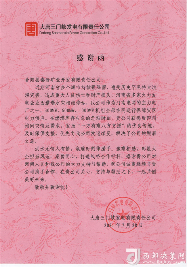 西部決策網(wǎng)訊 7月,受強(qiáng)對(duì)流天氣的影響,河南省多個(gè)城市持續(xù)遭遇強(qiáng)降雨,遭受了歷史罕見(jiàn)的特大洪澇災(zāi)害,給河南人民的生命財(cái)產(chǎn)造成嚴(yán)重的損失,多家火力發(fā)電企業(yè)因遭遇水災(zāi)相繼停運(yùn)。陜西秦晉礦業(yè)集團(tuán)公司聞?dòng)?,即刻與運(yùn)輸距離相對(duì)較近的大唐三門(mén)峽發(fā)電有限責(zé)任公司取得聯(lián)系,詢問(wèn)災(zāi)情及需求,當(dāng)獲悉發(fā)電燃煤庫(kù)存告急的危難時(shí)刻,秦晉集團(tuán)在燃煤緊缺的情況下,克服重重困難,急災(zāi)區(qū)人民所急,緊急向三門(mén)峽發(fā)電有限公司發(fā)運(yùn)燃煤3萬(wàn)余噸,解決了燃眉之急,確保了發(fā)電機(jī)組全部在網(wǎng)運(yùn)行,保障了災(zāi)區(qū)人民的電力供應(yīng),為災(zāi)區(qū)人民提供了及時(shí)的保供支援。